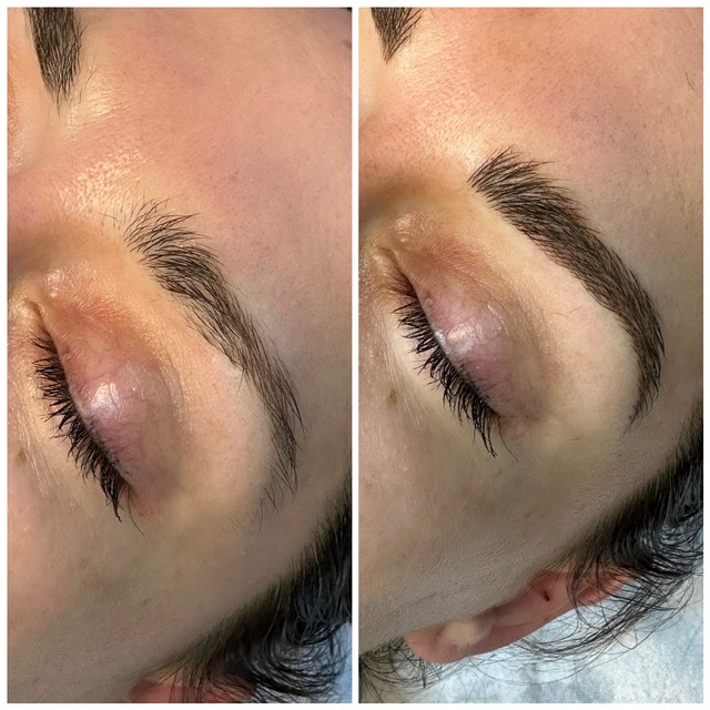 A cosmetic procedure that involves reshaping and setting the eyebrow hairs in an upward direction to create a fuller and more defined look. It uses a chemical solution to relax and set the brow hairs in place, giving the appearance of thicker, more groomed brows